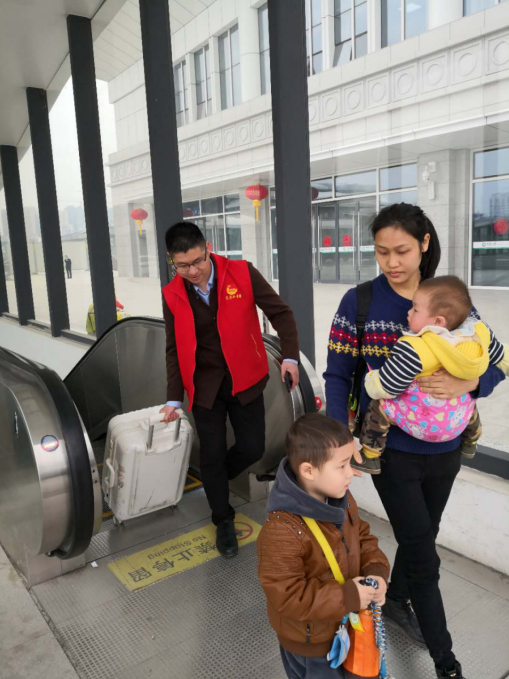 在火車(chē)站服務(wù)最需要幫助的有三種人:一種是殘疾人,一種是老年人,另外一種就是一手抱著小孩、一手提著行李的旅客因新建火車(chē)站剛剛啟用,“請(qǐng)問(wèn)進(jìn)站口在哪兒?當(dāng)一位拿著大包小包還帶著孩子的旅客問(wèn)到。“在這邊,我來(lái)幫你。”志愿者一邊指著路一邊接過(guò)旅客手中的包,一路將她送至進(jìn)站口